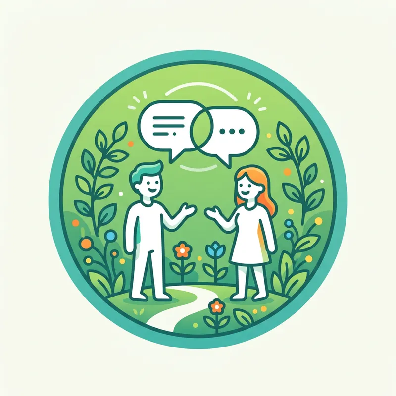 Create an icon for a social networking platform called 'Social Garden'. The icon should highlight the theme of communication and interaction among users so include simplistic interpretations of individuals in conversation.