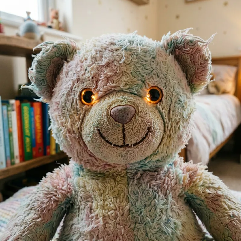 A close-up image of a child's soft, plush toy. The toy is frayed around the edges, showing its age and use. It has a friendly smile, button eyes that have a comforting glow, and its fur is an inviting mix of pastel colors. The background is a cozy, well-lit room with a child's bed adorned with other toys, a wooden shelf filled with colorful storybooks, and a small bedside table with a night lamp on it.