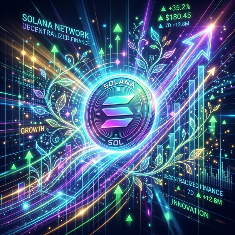 An artistic representation of the Solana cryptocurrency. The image should illustrate a robust coin inscribed with the Solana logo, shining brightly against a backdrop of radiant digital lines ascending upwards, symbolizing a rising price chart. Around this central focus, integrate intricate details associated with financial growth, such as small arrows pointing upwards, glow of green lights, and flourishing vines. Through the use of holographic colors and high-tech digital aesthetics, convey a scene that is both futuristic and optimistic.
