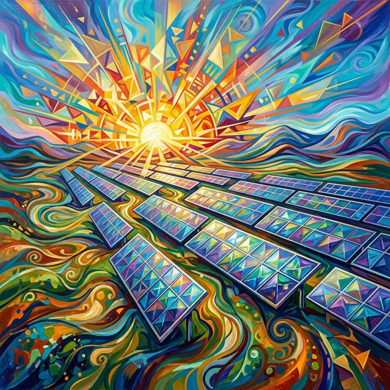 An abstract depiction of solar panels. There are neatly aligned rows of solar panels under bright sunlight, glistening with an iridescent play of colors as they capture and convert the radiant energy. Behind them, an abstract interpretation of the sun rises, its rays a multitude of geometric shapes shooting across the sky, illuminating and powering the renewable energy technology. The landscape around the solar farm is stylized, composed of swirling patterns and splashes of color, perhaps a metaphorical representation of the earth gaining energy from the sun.