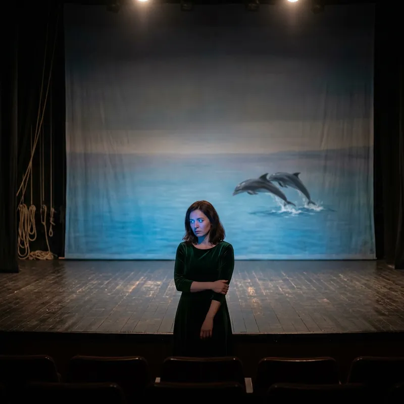 Solitary Figure on Stage with Glowing Blue Eyes and Dolphins