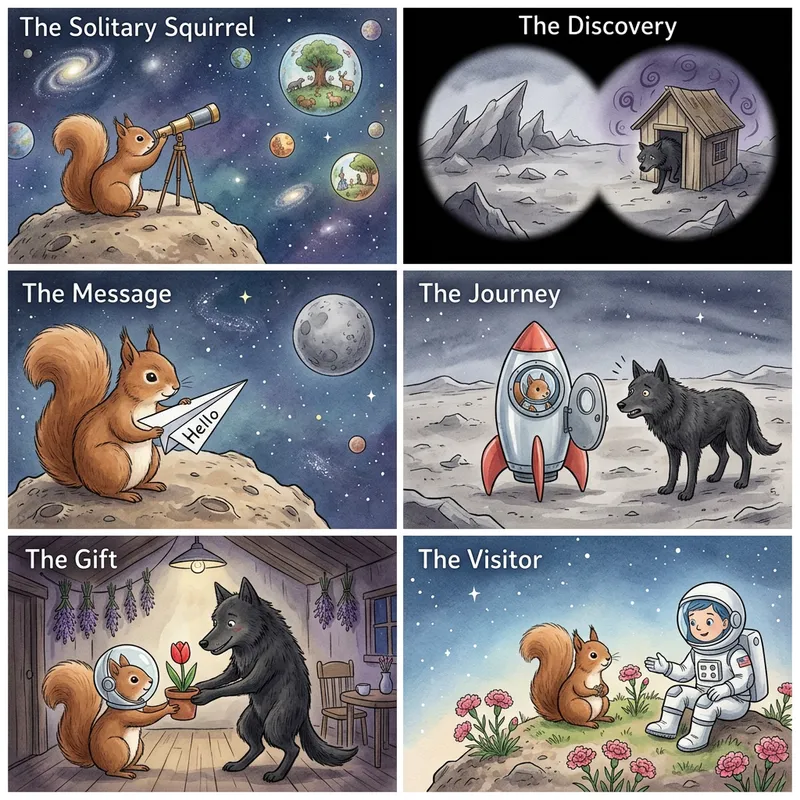 There was once a solitary squirrel on its planet, with nothing else to do but observe the universe through its tiny telescope. It saw planets filled with animals of beautiful plumage, bushy manes or no fur at all, plants as large as buildings, and small plants of all colors, beautiful princes and princesses in stunning dresses and suits. The squirrel dreamt of traveling to these locations and experiencing new things. One day, through its telescope, it spotted a grey planet with a sad little hut, from which emerged a black wolf with a dark aura that seemed agitated. Despite the squirrel having seen so many vibrant princes and princesses, beautiful stones, and grand structures, it found the wolf to be the most mesmerizing and beautiful creature it had ever seen. The squirrel started observing the wolf daily. It decided to contact the wolf and scribbled a 'hello' note on a piece of paper, turned it into a paper plane, and launched it into space. Although there was no response that day, a returned plane with a reply was found the next morning. This exchange of paper plane messages continued, until one day, wanting to meet the wolf in person, the squirrel donned a spacesuit, boarded a rocket, and journeyed to the wolf's planet. After returning home, the squirrel found a sprouting seedling. It began taking care of it, watering it daily. Eventually, it blossomed into a beautiful red tulip. The squirrel thought the wolf's planet could use such beauty and gifted it the tulip. The wolf, in gratitude, invited the squirrel inside its colorful, lavender-scented home for tea and conversation. Despite the wolf's promise to take care of the tulip, one day, the squirrel saw that the gifted tulip had withered. Upset, the squirrel lost its trust in the wolf and severed ties. Time passed, and the squirrel did not see the wolf again. On the squirrel's planet, pink carnations began to sprout which it nurtured with love. Then one day, an astronaut with beautiful eyes landed on the squirrel's planet and they shared a conversation.