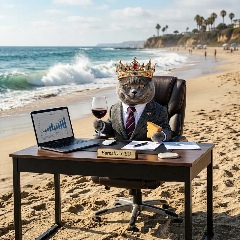 A feline figure, attired in sophisticated office wear, is seated at a sleek office desk. This cat is notably donning a regal crown on its head. It holds a classy wine glass in one paw and a delectable piece of cheese in the other. Adding an unexpected twist to the scene, the entire setup is situated on a scenic sandy beach, resounding with the soothing sound of crashing waves and fostering a surreal yet charming juxtaposition.