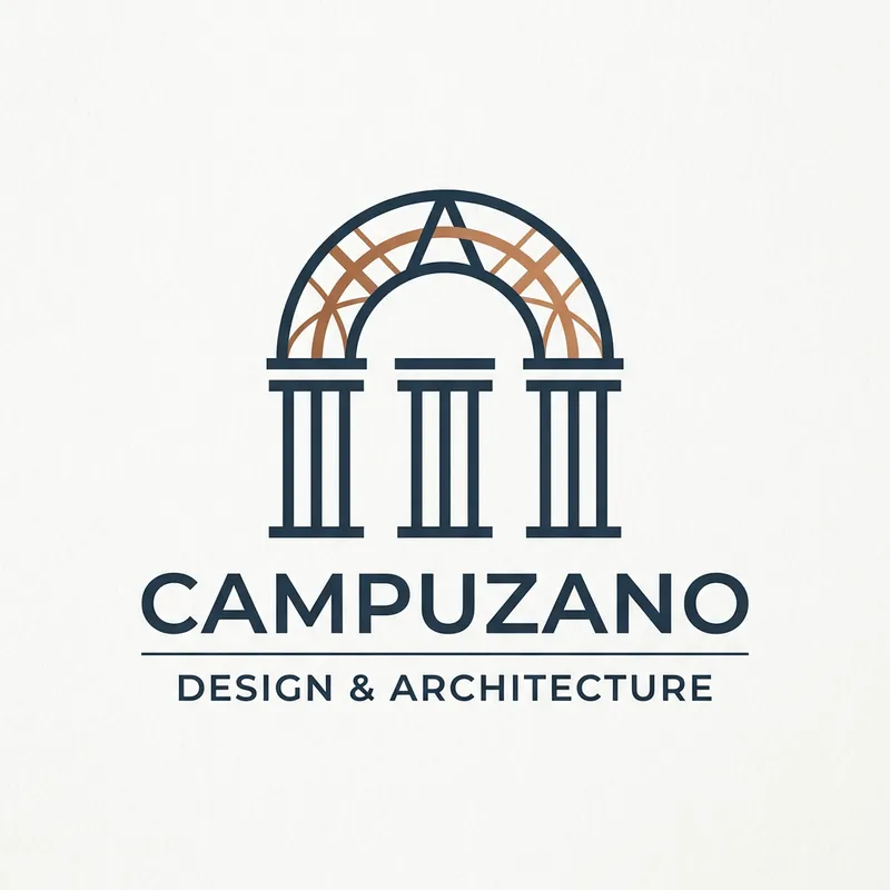 Create a sophisticated logo for a company named 'Campuzano Design & Architecture'. The logo should incorporate elements of architectural design like geometric shapes, lines, or blueprints. Perhaps include several pillars or an arch to signify strength and stability. Make the overall color scheme clean and modern, with a stylish font for the company name. The logo should communicate professionalism, creativity, and innovation.