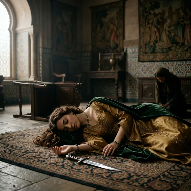 A sorrowful scene in a royal setting depicting a tragic occurrence. A princess adorned in a golden gown with gentle, curly brown hair and emerald eyes lying lifelessly on the floor. She is from a Middle Eastern descent. A mysterious shining, silver dagger is present on the floor besides her. The ambient light cast long shadows over the scene, creating a somber mood. Please portray the scene in a respectful and non-graphic manner, focusing on the emotion and setting rather than the violence.