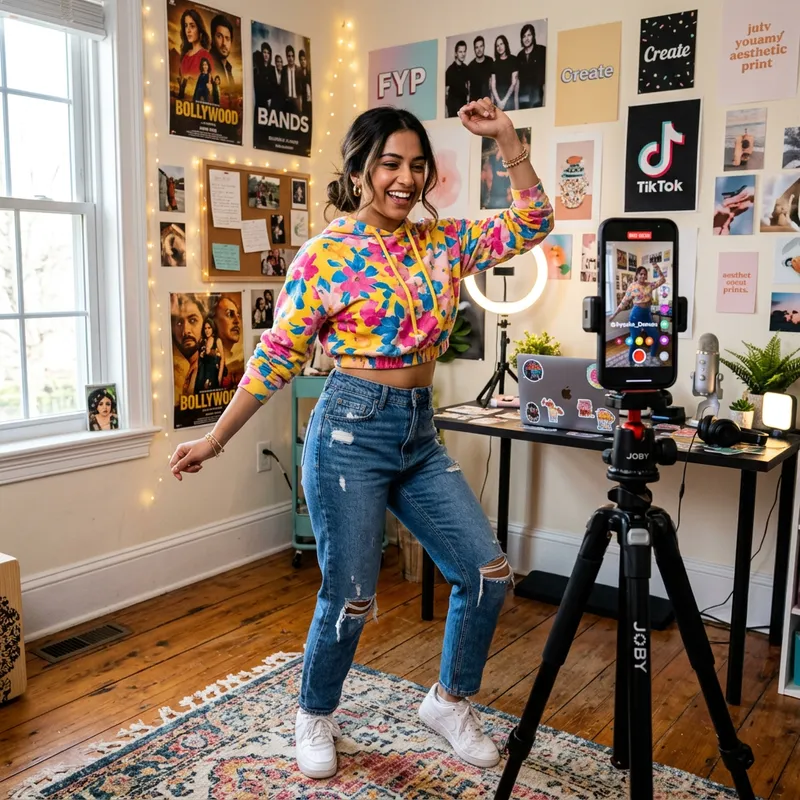 A young South Asian woman is recording a short video for a popular social media app. She is standing in a well-lit room looking at the camera mounted on a smartphone tripod. She has on a vibrant, casual outfit, her hair styled in a loose side bun. The room is decorated with wall posters and a desk to one side holds tech gadgets. She is performing a popular dance routine with bright expressions, her movements graceful and energetic.
