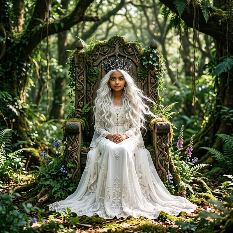 A South Asian girl with long, oval white hair. She is wearing a long white dress, her eyes are emerald green. She is sitting on a throne in the middle of the forest and wearing a black crown.