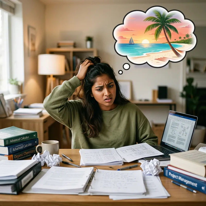 Imagine a scene of an individual of South Asian descent, sitting at a desk looking perplexed, with books and paperwork scattered all around the desk. This individual has a puzzled look on their face, suggesting something complex or confusing is going on. Above their head, a thought bubble appears, in which is an idyllic and inviting beach scene featuring a palm tree, symbolizing that the individual's mind is mentally escaping to a peaceful vacation despite the stress around them.