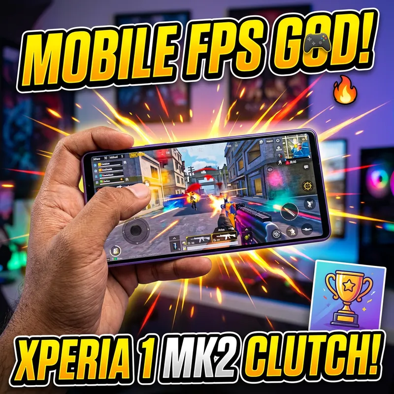 Generate an image representing a YouTube thumbnail for a video focused on hand-camera gameplay of a popular multiplayer shooter game. The picture should show a detailed and realistic human hand of a South Asian male, competently wielding a Sony Xperia 1 Mark 2 mobile phone. The screen should display recognizable gameplay graphics from the game. Include additional design elements such as action and excitement. Emphasize bright colors and bold typography to grab attention and attract clicks.