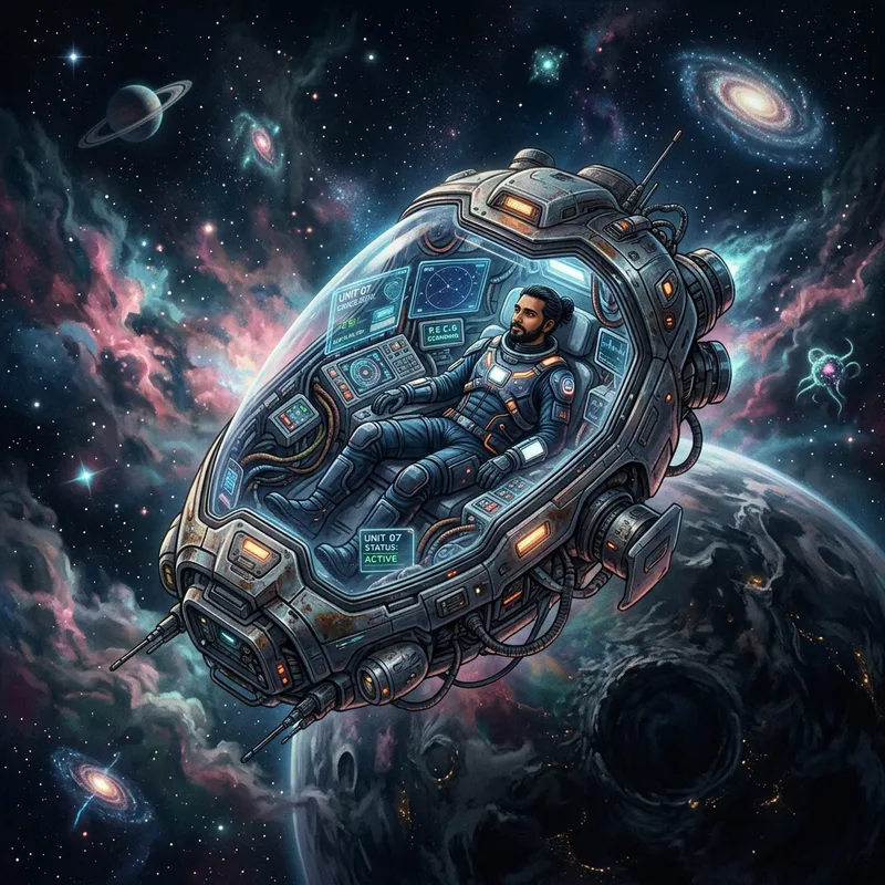 Intricate Illustration of South Asian Man in Creocapsule on Unknown Planet P.E.C.1.0