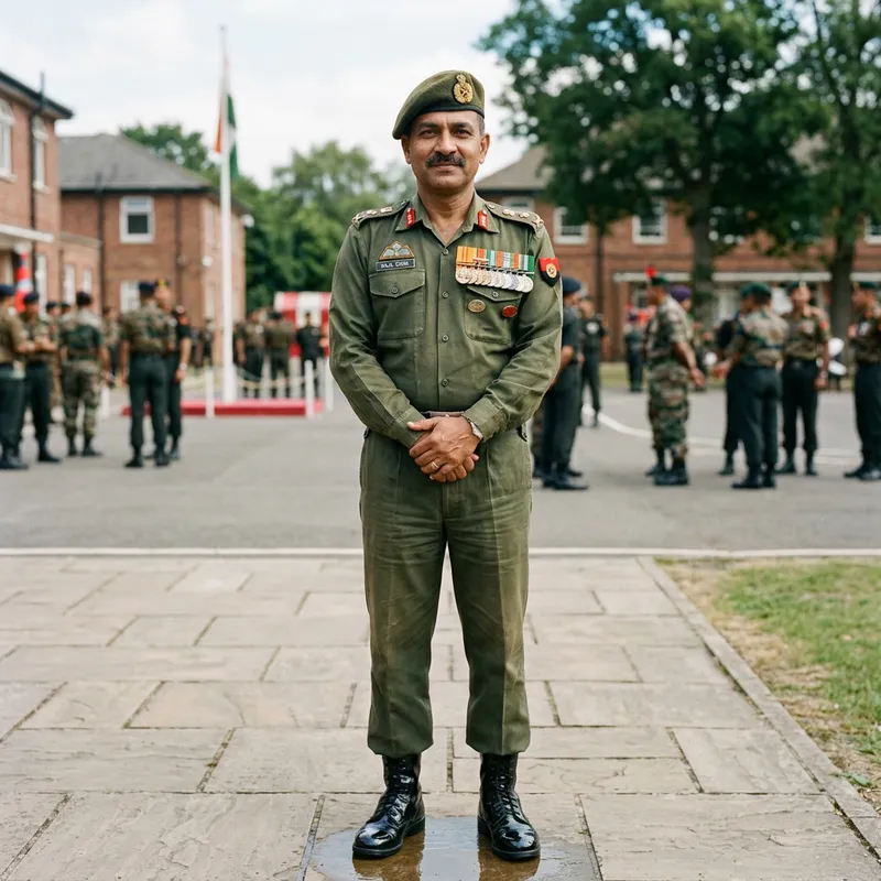 A man of South Asian descent is wearing a traditional green military uniform, complete with matching beret. His chest is adorned with a collection of varied service medals, each one reflecting his years of devoted service. He possesses a stern yet approachable demeanor. The fabric of his attire is weathered slightly over time, telling tales of the many missions he's been a part of. His boots are polished to a high shine job, showing his dedication to maintaining a well-groomed appearance even amidst all the demands of military life.