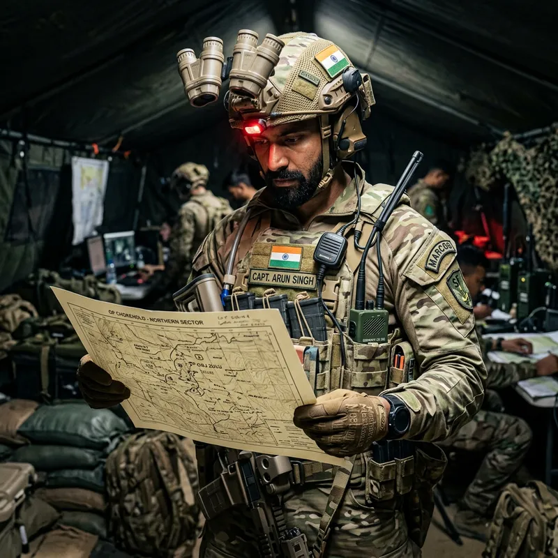 A special forces soldier of South Asian descent, holding an A3 format sheet of paper in his hands. The soldier is dressed in a full tactical uniform, including night vision goggles on his helmet and multiple pockets filled with various tools. He is holding the A3 paper with both hands, studying its contents with a focused expression.