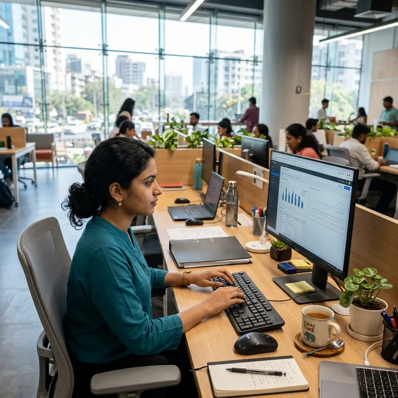 An image of a South Asian woman working diligently in a modern office setting. She is seated at her desk, surrounded by a computer monitor, keyboard, and various office supplies. There should be a mug by her side filled with tea. The woman has a concentrated look on her face as she is engaged in her tasks. Behind her, the office is filled with natural light coming from large windows.