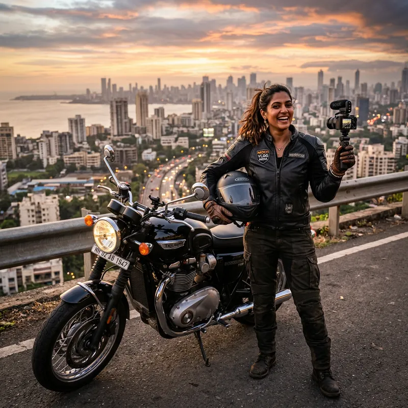 A South Asian woman standing next to a gleaming motorbike. She is dressed in biker gear - a black leather jacket, padded gloves and a helmet under her arm. She holds a video camera in her other hand, ready to document her journey. Her expression is cheerful, full of excitement for the open road ahead. A cityscape is outspread behind her, setting a busy, urban backdrop for her adventures. The light of the setting sun casts dramatic shadows, highlighting the sleek lines of the motorcycle and the blogger's determined figure.