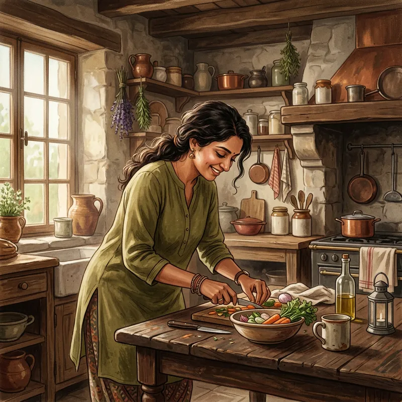 A South Asian woman dressed in casual attire is leaning over a wooden table in a rustic kitchen that exudes an old-world charm. The natural lighting filters in, lending a warm glow to the scene. The image captures a candid, beautiful moment, executed in a vintage film aesthetic that hints at nostalgia. The visual is digitally rendered, characterized by delicate and soft brushstrokes that add a layer of coziness to the atmosphere.