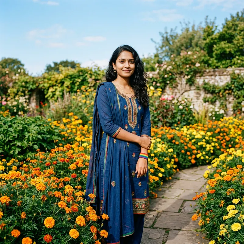 A young woman of South Asian descent with dark hair and brown eyes, wearing a traditional Indian Salwar Kameez. She is standing in a peaceful garden filled with vibrant marigold flowers. The air around her is warm and inviting as she smiles subtly, revealing a gentle confidence. Her posture exudes calmness and serenity. A bright rainbow bracelet adorns her wrist, symbolizing her identity as a lesbian. The clear sky above reflects the openness and acceptance she feels within herself.