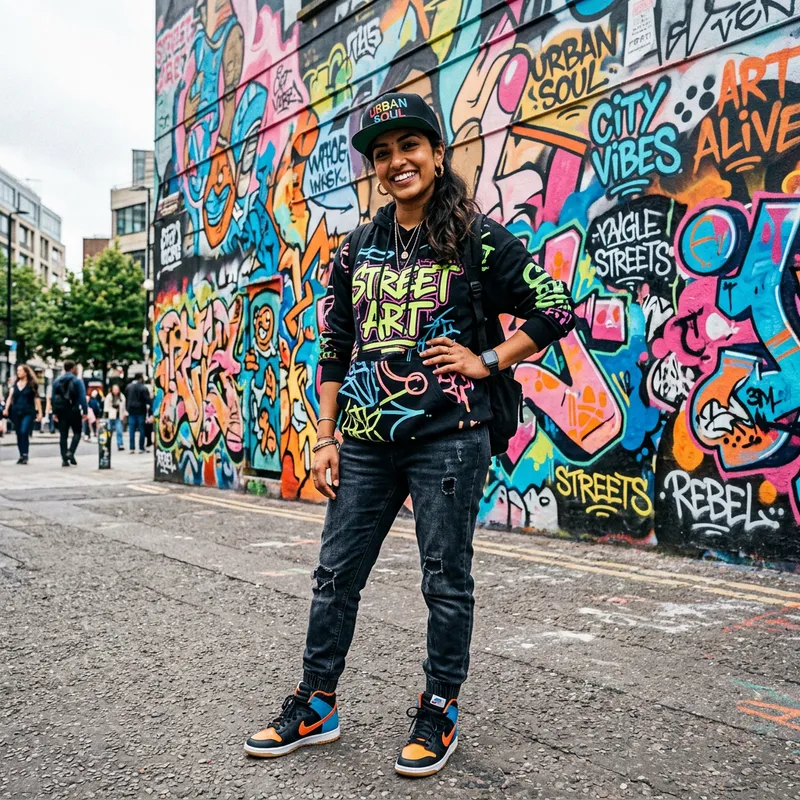 A South Asian young woman is standing against a color-filled graffiti wall. She is sporting urban streetwear, including a stylish snapback hat. Her stance conveys a blend of confidence and playfulness, embodying the energy of city fashion. This scene is depicted with the vibrancy and complexity characteristic of graffiti art, boasting a plethora of bright colors and intricate designs. It's as if captured through a DSLR camera, utilizing a wide-angle lens to ensure that all the vivacity of this urban fashion scene is entirely grasped.