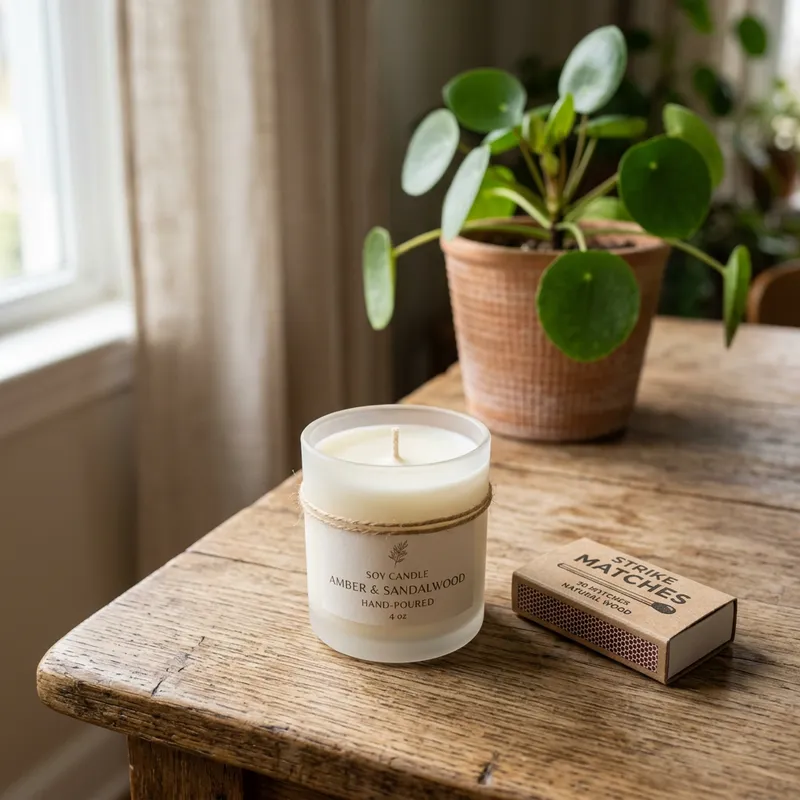 A soy candle with a smooth, creamy texture, housed in a small, frosted glass jar. The candle has a single, centered wick, and is unlit. Next to it rests a box of matches. The candle sits on a wooden table with a plant in the background.