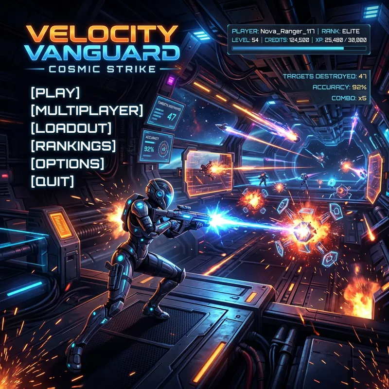 spaceship interior with shooting action, futuristic targets, vibrant colors, dynamic lighting, main menu style