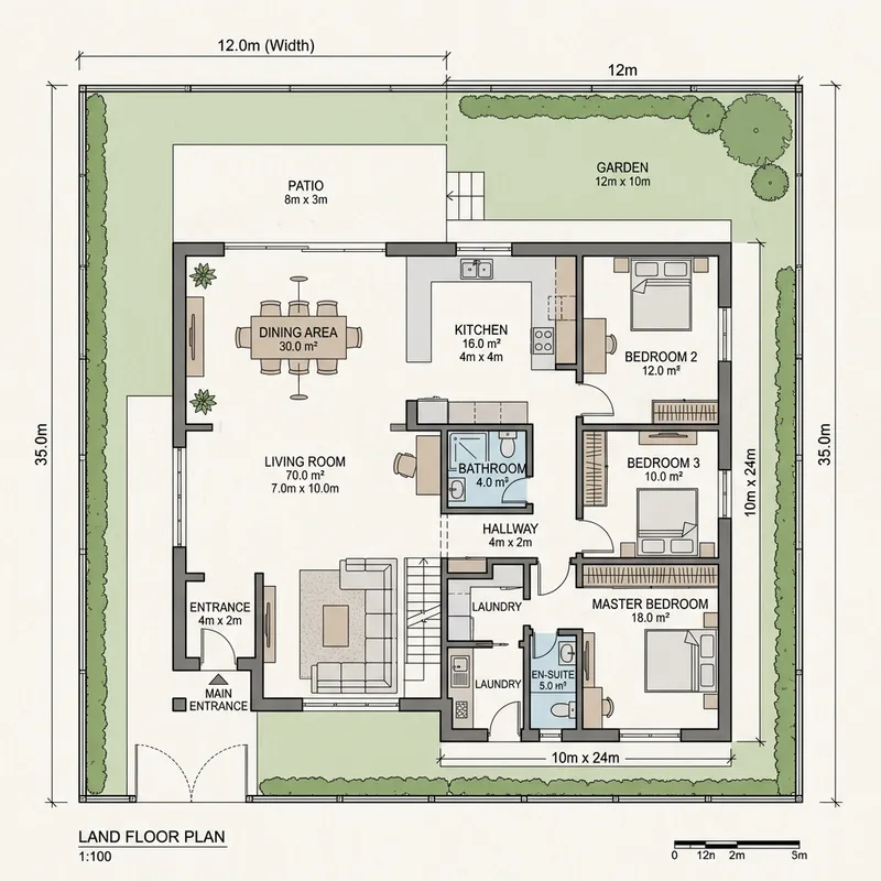 Create an image depicting a detailed floor plan for a land plot that is 12 meters wide and 35 meters long. This layout should incorporate a spacious living room with an area of 70 square meters, a bathroom covering 4 square meters, and factor in a 30 square meter space for a dining area with a food table. Please ensure that all elements proportionally fit within the given dimensions of the land.