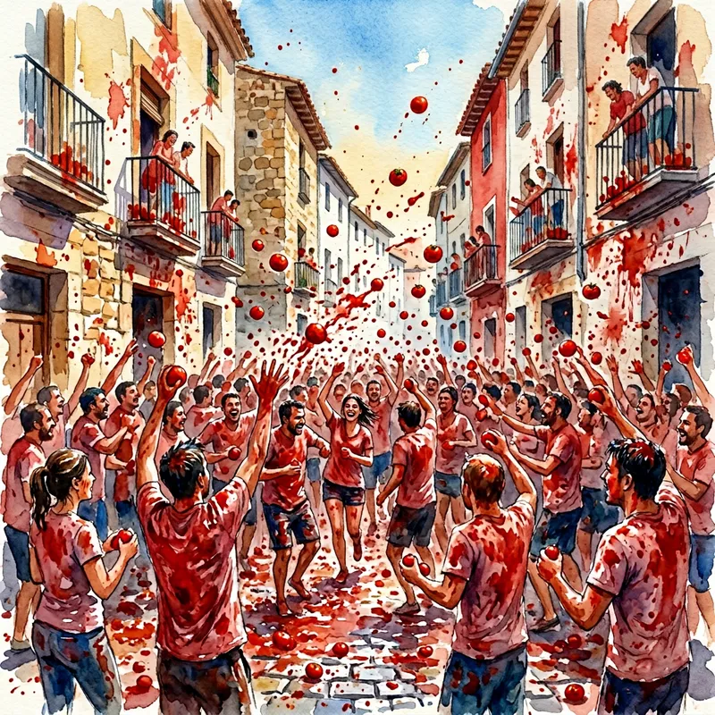 Envision a scene of the Spanish 'La Tomatina' festival. The image should appear as if painted in watercolor. The details are not vital; individuals should be abstract and unrecognizable. Pictorially capture the lively ambiance, the crimson red tomatoes flying haphazardly, the joyful expressions, and the buildings of the Spanish town lightly splattered with tomato residue.