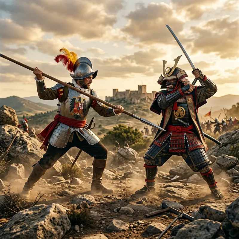 An Spanish soldier with a metallic helmet, a coat of arms and a lance, executing a combative stance against a Samurai from Japan, decorated in traditional armor with a katana, both poised on a rocky battleground under an afternoon sky.