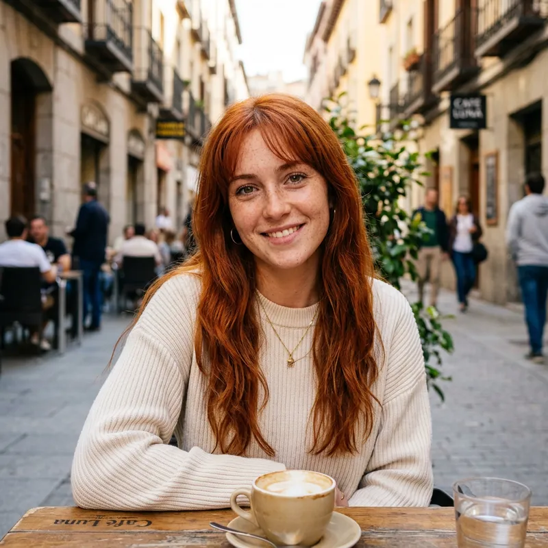 Spanish Woman with Red Hair, Freckles, and Korean-Style Bangs