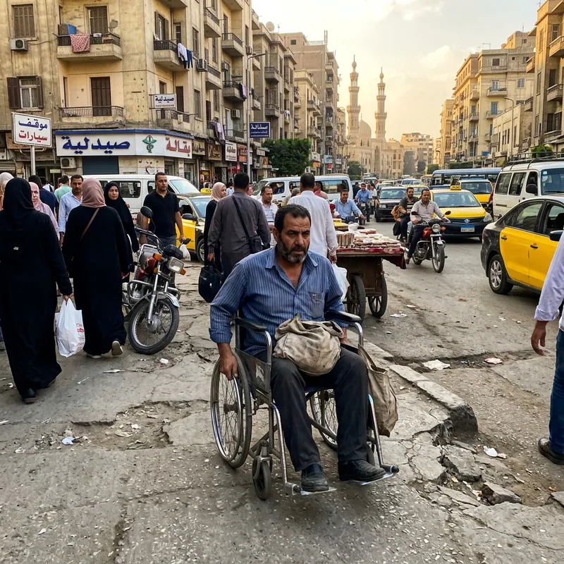 A poignant image representing the struggles faced by individuals with special needs in Egypt. Features a busy cityscape of Cairo with old and new buildings, and a foreground scene of a Middle-Eastern man in a wheelchair navigating the bustling sidewalks. An image representing the daily resilience of this man, that serves to highlight the need for accessibility improvements.