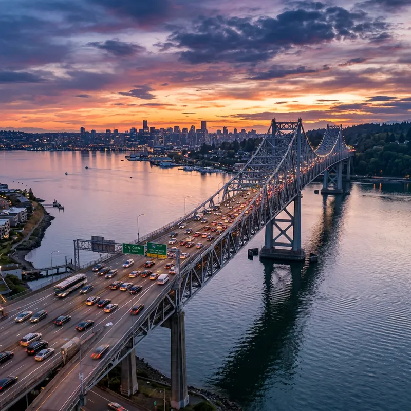 A broad scene of a highway bridge extending over a serene body of water. The bridge is a marvel of modern engineering, with intricate steel girders forming the main body, and concrete lanes where vehicles of various shapes and sizes are visible, indicatively displaying an ongoing rush hour. It is flanked by dimly lit street lamps, while a spectacular sunset blankets the scene, lending it hues of orange and purple. Far below, the tranquil water mirrors the picturesque scene with a touch of distortion, adding to the overall aesthetic of the scenery.
