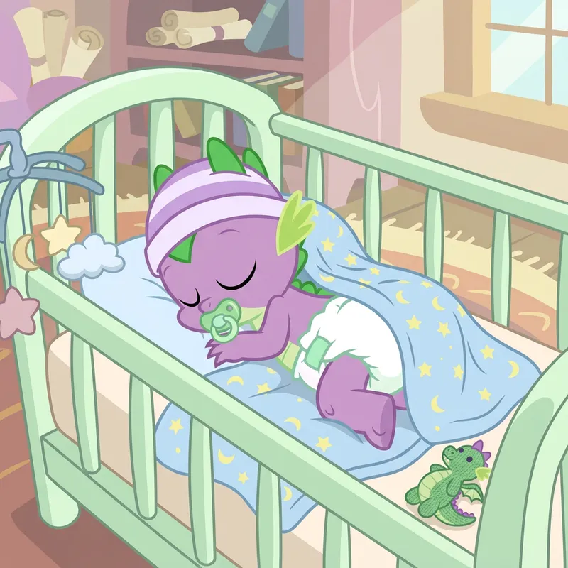Illustration of Spike, a dragon character from My Little Pony, depicted as a newborn. He is seen sleeping in a crib, wearing baby diapers and a pacifier. He is also donning a baby cap. Remember to maintain the animated style of the original 'My Little Pony' show.