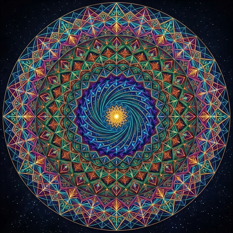 Create an image reflecting a spiraling geometrical design. It should exhibit symmetry and balance, with a series of concentric shapes interlocking and spiraling outward. The pattern should maintain its consistency, engrossing the viewer into its depths, similar to a vortex or a mandala. Incorporate a versatile color palette that complements the geometrical patterns and enhances the visual complexity of the design.