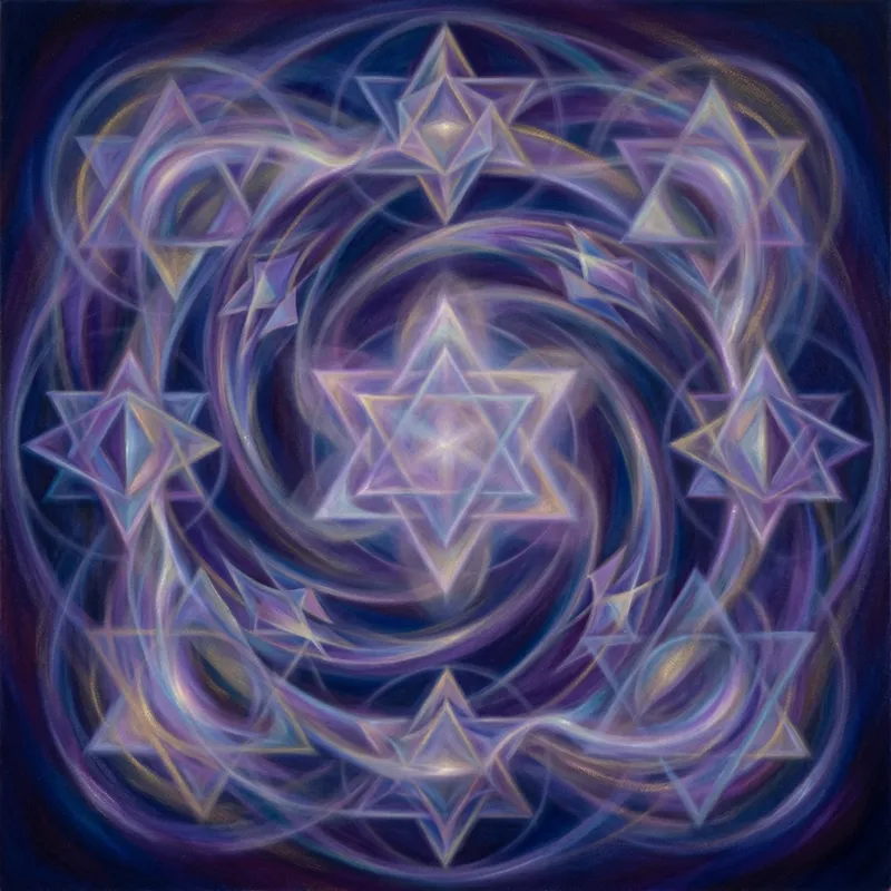 An abstract representation of the hexagrams, swirling in patterns of geometric shapes, painted in shades of blue and purple. The art is created in spiritual style, similar to pre-1912 spiritual artists known for their meaningful, ethereal, and symmetrical artwork but in no way a direct imitation of any specific artist. The image appears as if it has been captured with a long exposure to emanate a sense of movement and mysterious vibes, drawing the viewer into a deep exploration of spirituality.