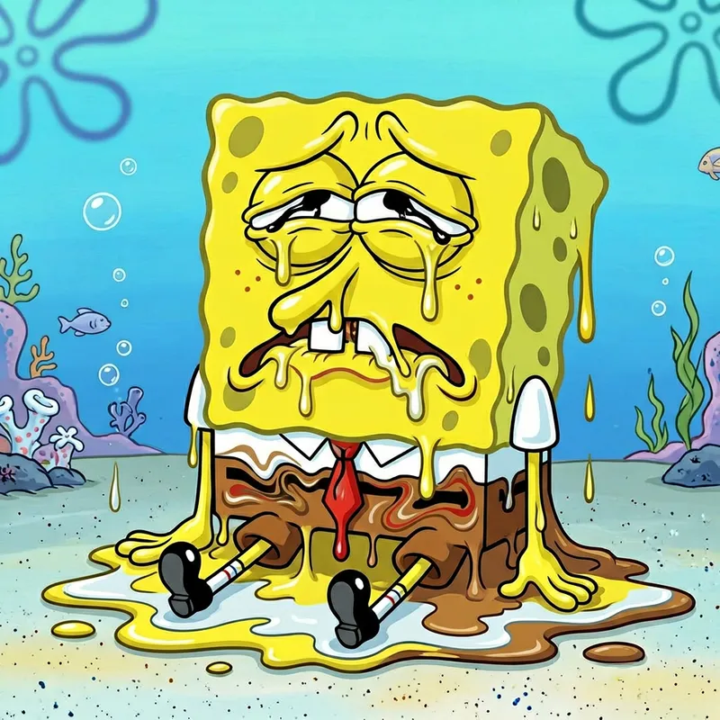 A square-shaped, bright yellow anthropomorphic sponge character in a state of melt. His normally cheerful facial features are elongated, dripping down as if made out of liquid. He has dark, round eyes that are similarly drooping, and a pair of buck teeth prominently placed in his gradually aligning face. His brown square trousers, white shirt and red tie also appear to be melting, distorting their usual sharp square lines. The ensemble set against a simple backdrop of light blue underwater scenery, giving a stark contrast to the melting figure.