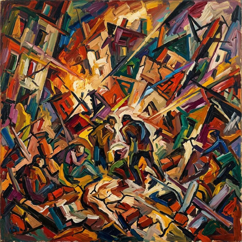 Depict the aftermath of an earthquake in a style described by three adjectives: spontaneous, dynamic, and emotional. Ensure these elements embody the spirit of pre-1912 abstract movements using mostly oil paints in the artwork.
