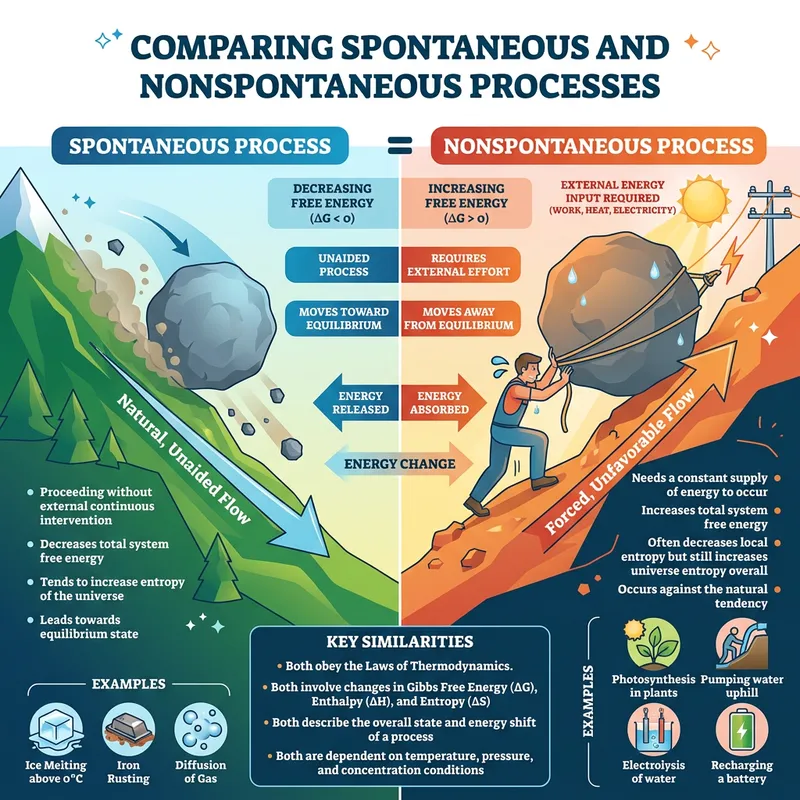 Create an elaborate visual representation comparing and contrasting spontaneous and nonspontaneous processes. On the left side of the image, demonstrate a ‘spontaneous process’ with a visual metaphor, perhaps depicting a boulder rolling downhill, signaling the natural, unaided nature of such processes. On the right, show a 'nonspontaneous process' with another metaphor, perhaps a person pushing a boulder uphill, displaying the external effort needed. Encapsulate both sides with labels, arrows, and textual annotations, clearly outlining the key differences and similarities.