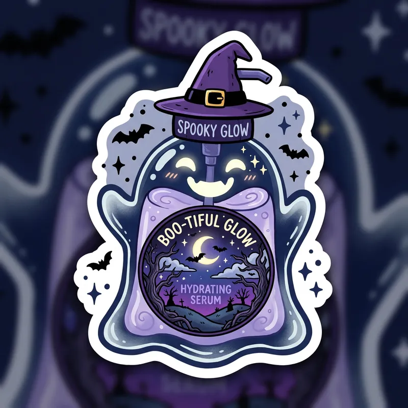 Design a sticker inspired by skincare products. Use spooky elements to enhance the design. This design should portray a skincare bottle that is shaped like a shadowy, grinning ghost. It should also contain a pump dispenser that resembles a witch's hat. The label on the skincare bottle should depict haunted trees and a moonlit sky. Include black bats as decorative elements on the background. The color palette should be a harmonious mix of midnight blues, eerie purples, and ghostly whites, and the style should be playful and whimsical. Make sure the sticker maintains a friendly and not too scary aesthetic while still keeping the spooky theme intact.