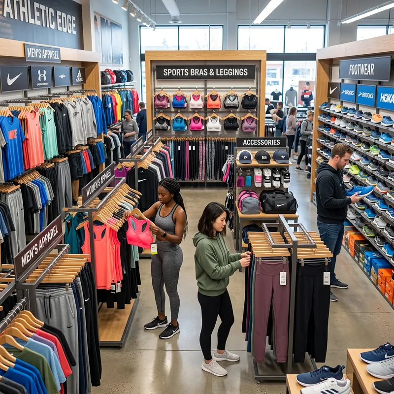 A detailed view of a sports clothing store. A variety of athletic apparel is on display; t-shirts and tank tops of varying colors, shorts, and sweatpants. Also, a section dedicated to sports bras and leggings. The shoes section showcases a range of running shoes, cleats, and sneakers. Accessories such as hats, headbands, sport socks, and gym bags can be seen. For the shoppers, include a Caucasian male analyzing a pair of running shoes, a Black female checking out a neon sports bra, and an Asian female contemplating over a selection of yoga pants.