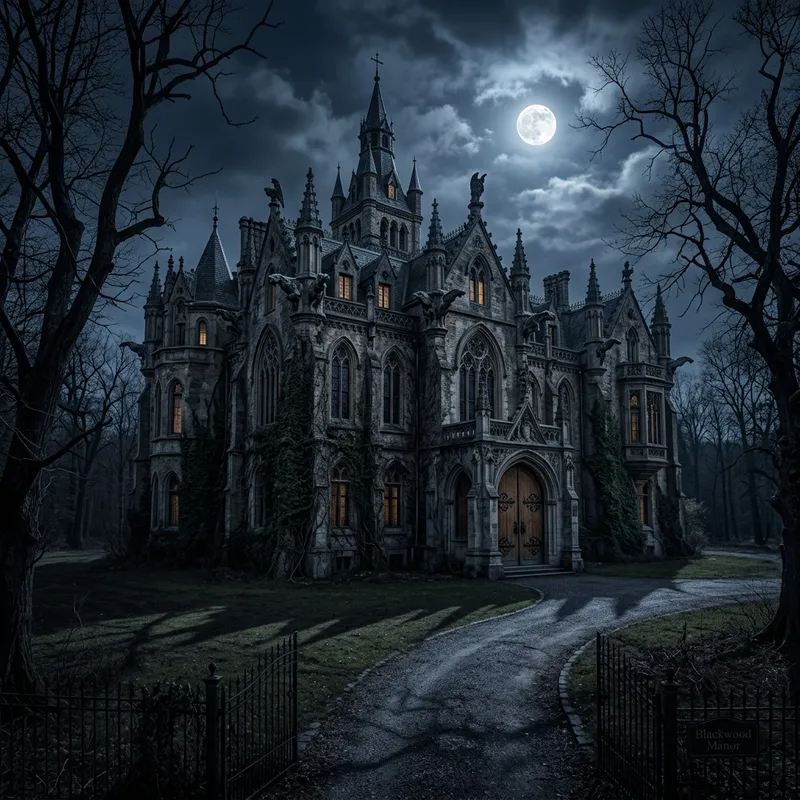 A sprawling mansion designed in Gothic architecture stands majestically. The facade flaunts pointed arches, tall narrow windows, and intricately carved stone gargoyles. Ivy climbs up its stone walls, adding a touch of nature to the imposing man-made structure. Weather-worn, the mansion is a testament to its age and the weight of history it carries. Its massive wooden doors are shut, suggesting an air of mystery about what lies within. The mansion is set amidst a large plot of land, with towering leafless trees surrounding it, casting long shadows in the moonlit night.
