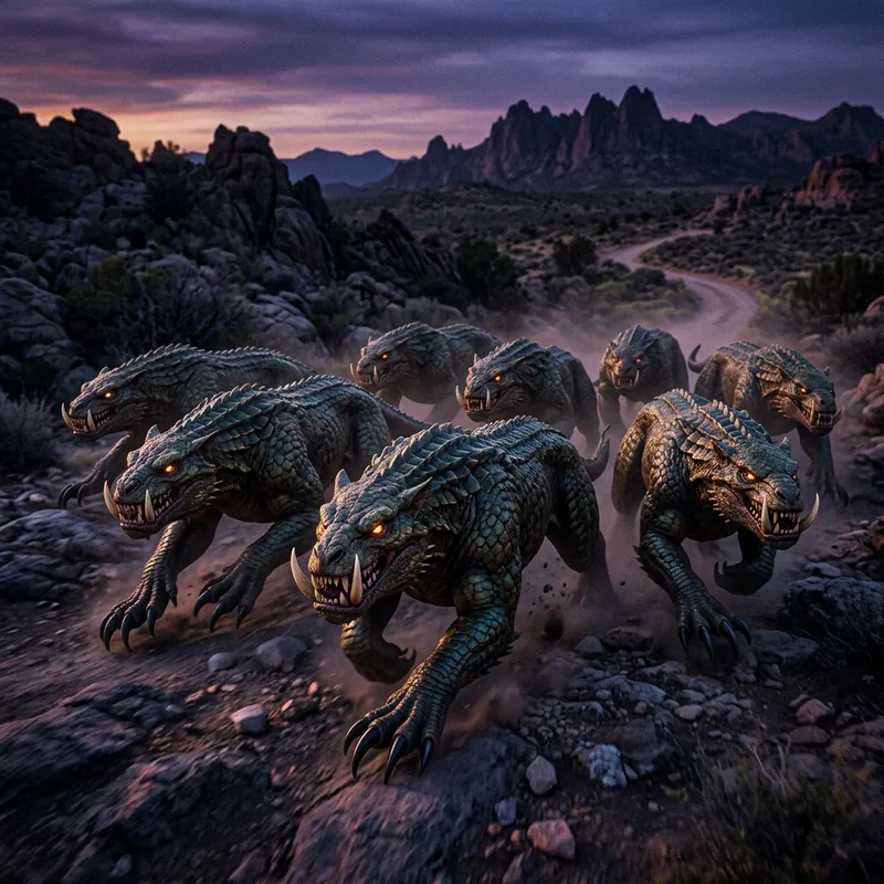 A squadron of baghirs, fantastical creatures with long, scaled bodies, enormous claws, and tusk-filled maws. These fierce beings are seen together in a formation, charging through a rugged terrain draped in eerie twilight, their eyes ablaze with predatory determination.