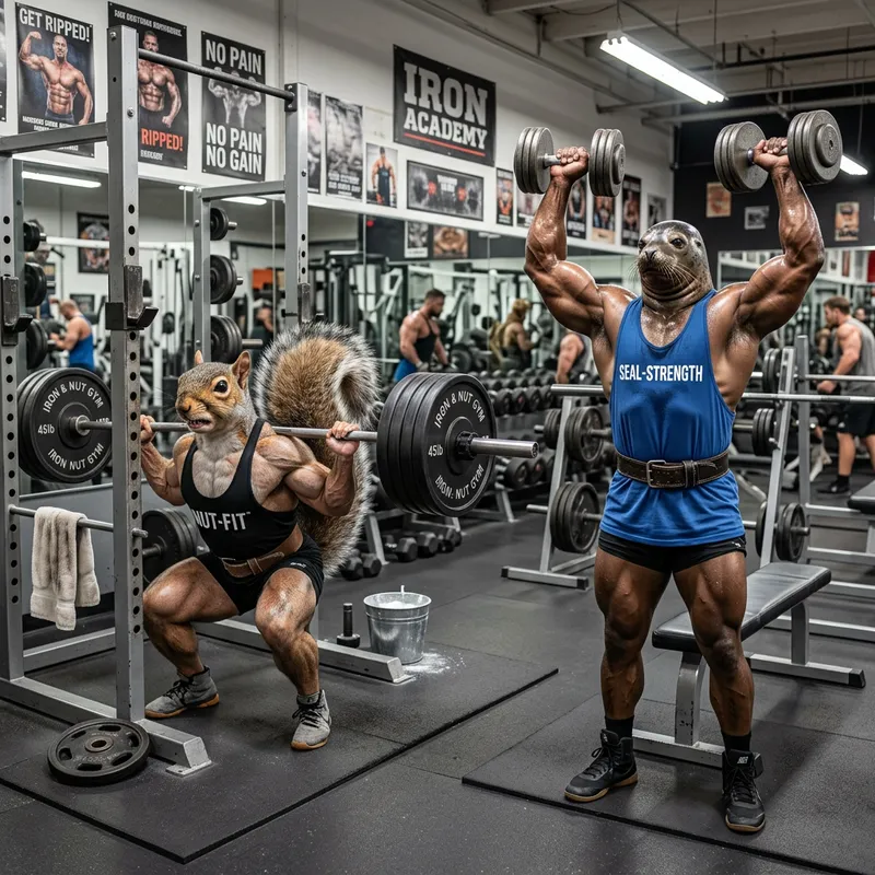 Squirrel and seal bodybuilders are engaged in fitness in the gym.