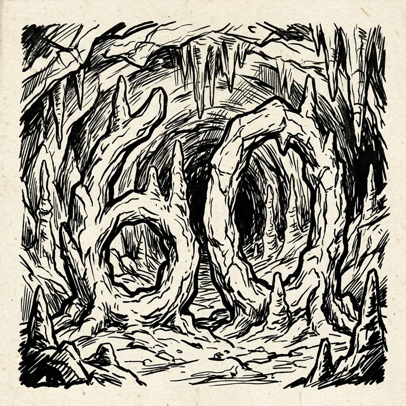 A cave interior revealing a unique and natural configuration of stalagmites. They are arranged organically yet remarkably they come together to form the number '60'. Imagine it as a simplistic but striking graphic design, achieved through the use of bold and strong lines that mimic the look and feel of ink on paper.