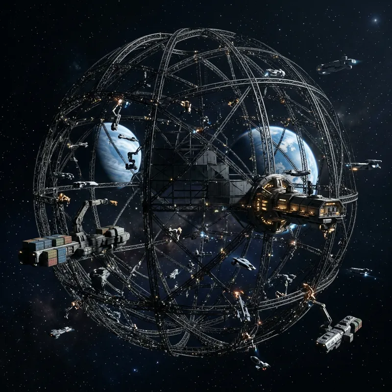 Imagine a massive spherical structure in the vacuum of space, hinting at its intimidating final shape, a mere 10% complete. The visible framework exposes a lattice of crisscrossing beams and struts that glint in the starlight, a sign of the intensive labor being put into its construction. Countless spaceships swarm around it: cargo ships, small shuttles, and construction bots. All are engaged in the mammoth task of slowly piecing together this colossal structure. It's a vast project, still in its early stages, looking like a framework of a massive, unfinished sphere against the endless expanse of the cosmos.