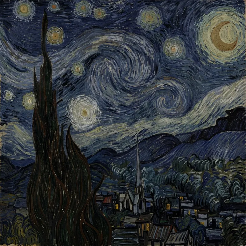 Starry night by van Gogh style but more like painful night and far pov, less colorful, changing structures in need.