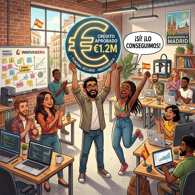 An illustration showing a startup in Spain receiving a credit in euros. The scene should depict a startup office environment with a diverse group of workers. One person, a South Asian male, is holding a large euro symbol signifying credit. Another person, a Black female, is visibly excited about the news. The office setting includes tech-related items like laptops, whiteboards filled with ideas, and perhaps an open layout common in modern workplace. The presence of Spanish cultural elements, like a small Spanish flag or pictures of Spanish landmarks, indicates the location.