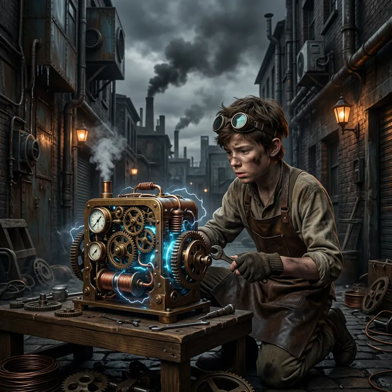 In a future chaotic world, steampunk technology has flourished, transforming each device into a steam and vapor-operated tool. In the classic city of Steamhaven, where black clouds always cover the sky, there is a boy named Alexander. He is a talented mechanic but always looked down upon due to his poor family background. One day, Alexander discovers an ancient machine, abandoned in a secluded corner of the city. He embarks on a journey to restore it. The machine, emitting sparkling light and strange energy after restoration, is not just an ordinary object but holds a terrifying power. With the help of his new friends, Alexander ventures to unravel the secrets of the machine, prevent a dark conspiracy, and possibly change the fate of Steamhaven. No ordinary adventure, their steampunk journey will lead them through the mysteries of technology and magic, and the power behind the ancient machine - a journey full of wonder and danger.