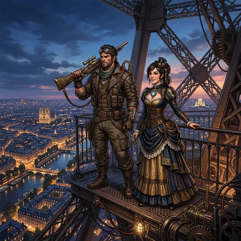 A pair of video game characters in the style of conceptual steampunk design, both standing on the peak of a world famous iron lattice tower located in Paris. One is a male with a strong physique, donning a rough, adventurer outfit paired with a vintage firearm. The other is a female, with a Victorian era dress and a lively aura, sporting a pendant around her neck. The cityscape of Paris sprawls out beneath them, with twinkling lights illuminating the romantic evening.