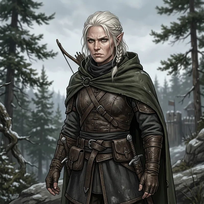 Create a detailed illustration of a stern half-elf girl, representing a rogue class character with strict northern features. She possesses striking blonde hair, hinting at her unique lineage. Notably, her characteristics should impart her nature attuned to the raw instincts of the North.