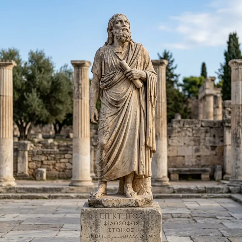 A stone sculpture of the ancient Greek philosopher, Epictetus. The elderly philosopher is depicted as a bearded man, chin lifted high with a thoughtful expression. He stands upright in a traditional Greek toga, one hand clutching a scroll- a symbol of his wisdom and teachings. The details are meticulously carved, giving a lifelike quality to his features. His long hair flows down his back, and his cloak is gathered in draped folds. The statue stands on a pedestal inscribed with Greek lettering, adding to the authenticity of the scene. The stone is weathered and aged, symbolizing the passage of time.