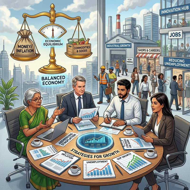 Visualize a scene depicting these strategies for addressing stagflation in a country. At the center, a group of diverse economists, each of distinct descents like South Asian, Caucasian, Middle-Eastern, and Hispanic, both male and female, are gathered around a large, round table with charts and graphs showing economic trends. These economists are deep in discussion, brainstorming, and developing plans to stimulate economic growth. To indicate the reduction of unemployment, illustrate people of different descents and genders entering modern workplaces, shops, factories, and industries. To represent controlling inflation, visualize a large balance scale in the sky, balancing a bag of money and commodities, signifying economic equilibrium.