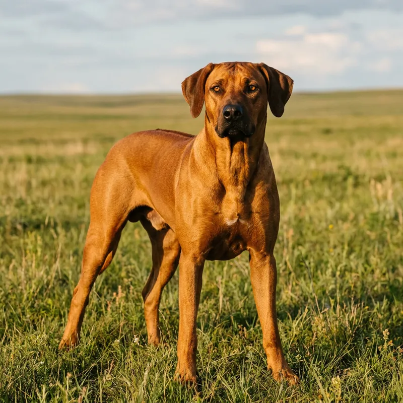 A sturdy and powerful dog, its muscles radiating vitality and strength. Its coat is thick and glossy, a testament to its good health. Its eyes are bright and alert, preventing anything from escaping its notice. The dog stands in a broad stance, a clear sign of its strength. Despite its power, there is a gentle side to it which is visible in the slight softening of its eye. The background is a simple grassy plain, accentuating the vibrant colors of the dog's coat and emphasizing its imposing presence.